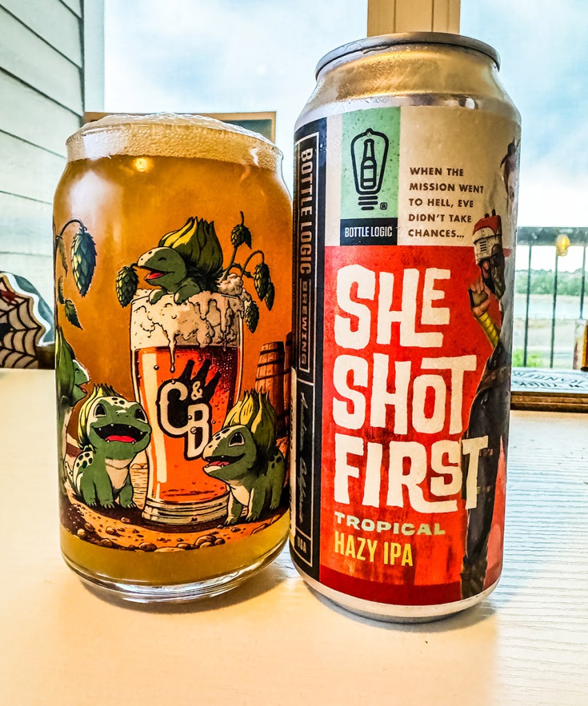 Bottle Logic: She Shot First – IPA / New England Tropical Hazy. The mission went to hell. Eve didn’t take chances… #SheShotFirst. This Hazy IPA is an evolution of one of our opening-day beers, brewed with Mosaic, Simcoe, and El Dorado hops, and now finished with a clean shot of sweet pineapple and vibrant passionfruit