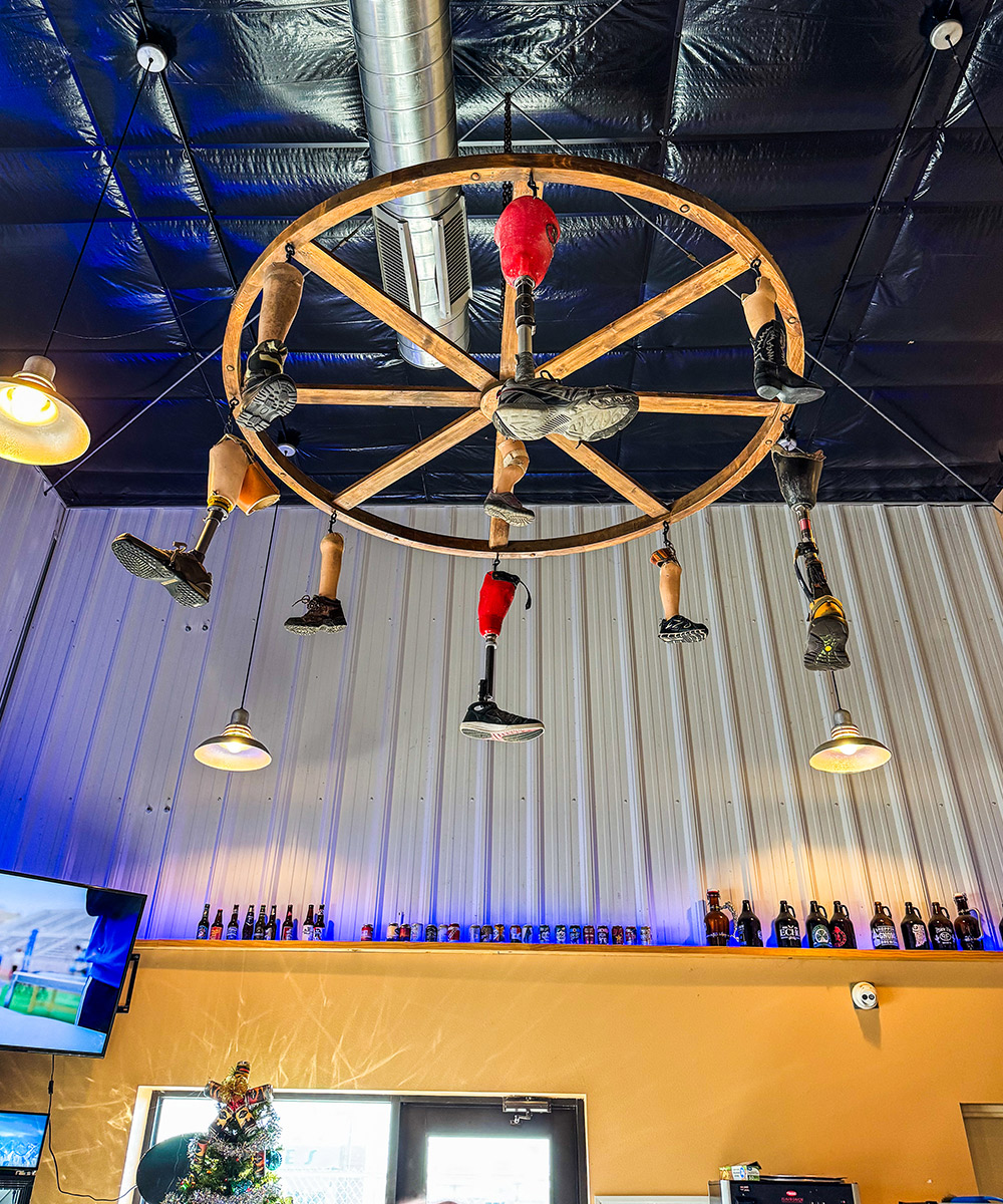 One final brewery the Parker Colorado peeps told us to stop at was Peg Leg Brewing. We were struggling to stay awake after the long detour in Decora. We didn’t know when we’d ever be making this journey again. Therefore, we sacked up and swung on into this one last brewery! We heard that the owner actually has only one leg. He kept all of his old peg legs hanging from the ceiling. Can confirm … those peg legs are for sure dangling from the rafters and it was absolutely awesome. The beer was decent. It could have just been so mediocre because we just came from Toppling Goliath. Most of them were just very crushable lager style bevies. So if you love that then you’ll love it here! It was pretty empty there. They had some solid prices on beer. Football was on, so it was a win-win. Check out them Peg Legs below!