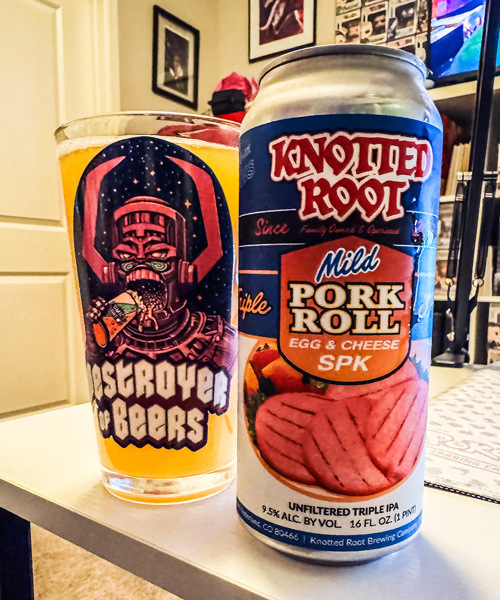 Knotted Root Brewing: Mild Pork Roll Egg & Cheese SPK – Pork Roll, Egg and Cheese, SPK” is an Unfiltered Triple IPA. Brewed with a gooey base of flaked oats, chit malt, and white wheat, we hopped this savory liquid with Citra, Motueka, and Riwaka with a touch of vanilla. It’s cautiously inspired by the “other” brand of our favorite New Jersey delicacy. We grew up with Taylor Ham, but there is no denying this is Pork Roll. Think Trenton tomato pie, Donkey’s Place, and savory breakfast sandwiches.